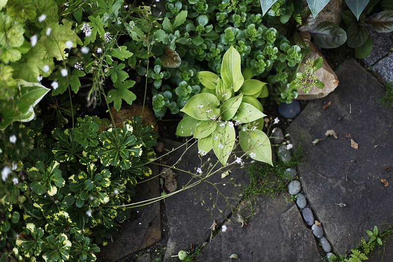Здесь подобраны разные хосты, от темных, до желтых, а также папоротники, например, у оноклеи светло-салатовые вайи.