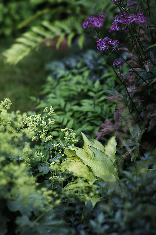 Очень хорошо, если контрастом будут темнолистные растения, как здесь - например, астранция.