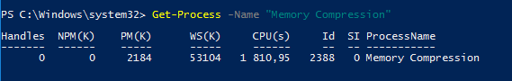 В Windows 10 Anniversary edition (1607) появился отдельный процесс Сжатая память(Memory Compression), скрытый от диспетчера задач. Получить информацию об этом процессе можно с помощью PowerShell командлета Get-Process: