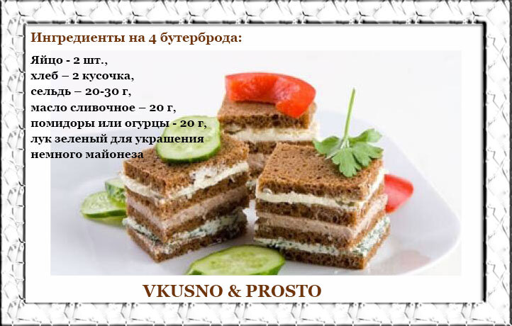 Полосатый, розовый и белый бутерброды.. Вкуснятина!!! Эти бутерброды легко можно сделать и на праздник, и на обычный семейный завтрак. Они красивые, вкусные - и - небанальные. 1. Полосатый бутерброд Приготовление: Ржаной хлеб намазать маслом, разделить его пополам или разрезать треугольничками. Получится 4 хлеба на 4 порции. Хлеб намазать маслом, филе сельди нарезать длинными полосками или мелко. Белок и желток режут по отдельности. Помидор или огурец шинкуются мелко вместе с луком. Укладывать так: на хлеб с маслом селёдку, дальше желток, слой майонеза, на него помидоры и сверху белок, ещё немного майонеза и мелко порезанный зелёный лук. Можно такие бутерброды сделать многоярусными. Они будут очень интересно смотреться на тарелочке. Украсят любой стол! 2. Белый бутерброд с брынзой и орехами Приготовление: Хлеб нарезать на 10 кусочков. Масло сливочное взбить венчиком. Брынзу натереть на тёрке и добавить к взбитому маслу. Размешать полученную смесь и намазать на хлеб. Ядра орехов мелко