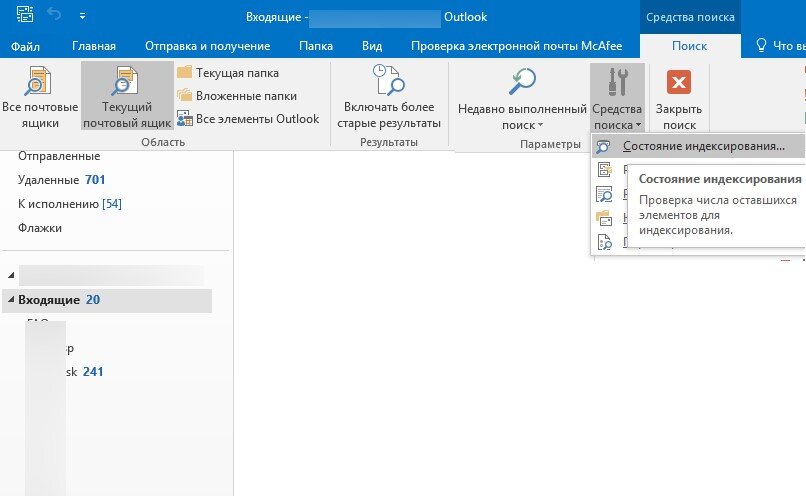 В том случае, если у вас наблюдаются проблемы с поиском по письмам в Outlook различных версий: поиск ничего не находит, выдает не полные результаты, не ищет по всем pst файлам и т.д, рекомендации из этой статьи должны помочь вам решить эту проблему (рекомендации применимы к следующим версиям Outlook 2010, 2013 и 2016). Проверка состояния индекса поиска в Outlook Возможность поиска по элементам Outlook осуществляется за счет построения и ведения индекса всех имеющихся элементов. Поэтому в первую очередь необходимо проверить состояние этого самого индекса. Для этого, перейдите на вкладку Поиск и в разделе Средства поиска выберите элемент Состояния индексирования. В том случае, если с индексом все в порядке, в появившемся окне должен стоять статус: Индексирование всех элементов Outlook завершено