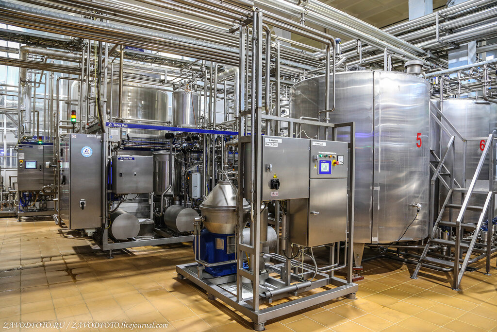 После этого всё сырье проходит процесс двойного очищения - механического и бактериального. Затем молоко нормализуется до необходимого содержания жира и уже далее подаётся на участок производства готовой продукции. По сути, все производственные процессы скрыты от нас. Умные машины позволяют здесь производить любой продукт бесконтактным методом от приемки до упаковки готового продукта, при этом на каждом этапе контроль за качеством только усиливается. Всё это исключает обсеменение молока на всех этапах производства.