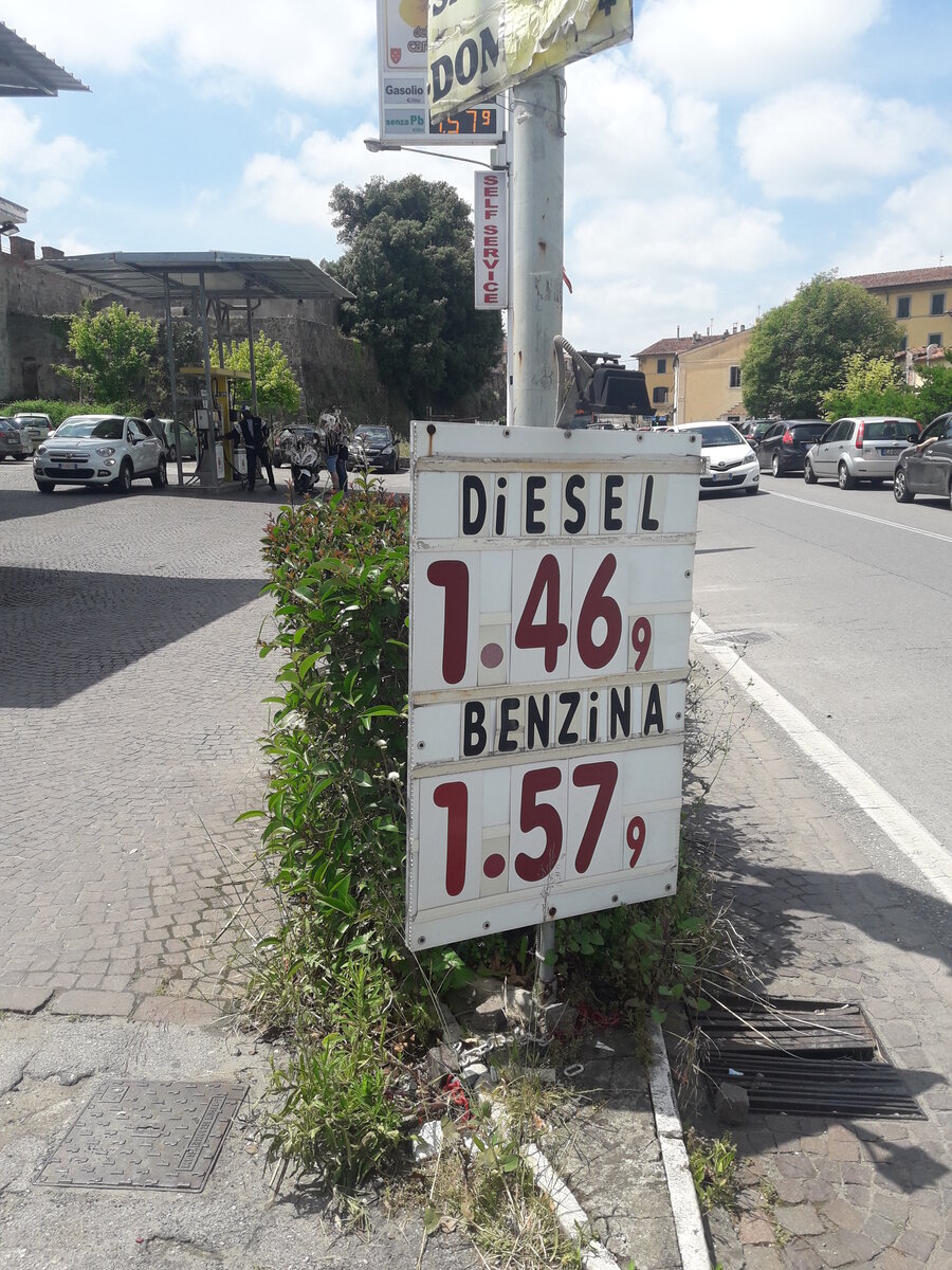 Если у вас арендован автомобиль, рано или поздно встанет вопрос, - как заправляться на автоматических заправках в Италии. Стоимость бензина в 2018 году в Италии показана на картинке. В зависимости от региона цена разнится на 10-20 евроцентов. Обратите внимание, что на заправках в Италии есть колонки с прикрепленными заправщиками (живыми людьми) и полностью автоматические. Выбирайте автоматические, там всё предельно просто, и не переплачивайте за бензин! Дело в том, что при заправке с живым человеком его услуги включены в стоимость бензина, а нам ведь не нужны переплаты, верно? На арендованном авто чаще всего будет указан тип топлива на приборной панели, а также на лючке бензобака. Алгоритм заправки следующий: 1. Подъезжаем в свободной колонке с нужным нам видом топлива 2. Открываем лючок бензобака. Шланг не трогаем! 3. Подходим к приемнику денег. Вносим наличные деньги, примерно рассчитав сколько необходимо залить топлива. С оплатой по карте не рекомендую связываться, т.к. часто мож