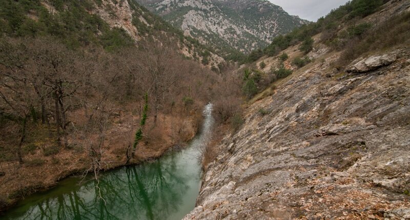 Каньон Чёрной речки (Малый каньон). Каньон простирается на целых 12 километров и берёт своё начало у скалы Кизил-Кая. Пейзажи на протяжении всей реки очень разнообразны: можно увидеть голые скалы, лесные чащи, водопады, опасные пороги, глубокие заводи. Из-за труднопроходимой дороги не каждый отваживается ехать в этот каньон. И зря. Природа в окрестностях Чёрной речки выглядит очаровательно, как будто находишься не в Крыму, а где-нибудь в Северной Америке. Посетить каньон можно в любое время года. Осенью там совсем ни единой души, поэтому можно почувствовать себя настоящим первопроходцем. Но отсутствие людей не отменяет того, что в каньоне существует множество туристических троп, по которым совершенно безопасно передвигаться даже со снаряжением. Кое-где можно увидеть вытоптанные полянки с оборудованным кострищем. Весной в лесу растут вот такие вот замечательные цветочки, которые усеивают целые поляны. Помимо этих часто можно встретить ещё ромашковые и одуванчиковые. Стоит отметить,