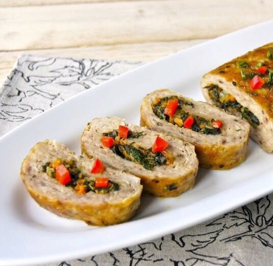 Ингредиенты: Мясной фарш - 700 г Лук репчатый - 1 шт. Морковь - 1 шт. Чеснок - 3 зубчика Паприка копченая - 1/2 ч.л. Шпинат - по вкусу Соль - по вкусу Перец - по вкусу Йогурт - 1 ст.л. Приготовление: 1. В мясной фарш добавить соль, перец, паприку, тертый чеснок и хорошенько перемешать руками. Прикрыть пищевой пленкой и оставить минут на 15. 2. Лук мелко порубить, морковь натереть на крупной терке, обжарить со шпинатом на сковороде до мягкости. Посолить по вкусу. 3. Добавить йогурт, снять с огня. 4. Расстелить пищевую пленку, на нее выложить фарш и разровнять. 5. На пласт из фарша выложить начинку ровным слоем. 6. При помощи пищевой пленки свернуть в рулет. 7. Расстелить фольгу нужного размера и аккуратно переложить рулет, пленку выбросить. 8. Рулет обернуть фольгой и поставить в разогретую до 190 градусов духовку на 1 час. Приятного аппетита!
