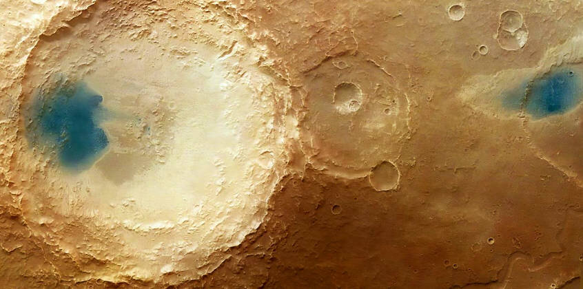Новорожденный Марс развивался, скорее всего, аналогично нашей планете. Но что-то там не заладилось. Какое-то время огромным количествам углекислого газа, выбрасываемого вулканами, удавалось удерживать солнечное тепло у поверхности планеты. Тогда существовали жидкая вода на Марсе и, возможно, какие-то формы жизни. Но потом вулканы потухли, концентрация газа в атмосфере упала, вода замерзла, а все живое на Марсе погибло от холода. Вода на Марсе важное открытие Присутствие воды в прошлом это очень важное открытие. Планета со следами водной эрозии могла быть обитаемой. Это стимулировало остатки следов вымерших организмов. В 1971 г. американская космическая станция «Маринер-9», первой выведенная на околомарсианскую орбиту, отметила присутствие ледяных полярных шапок, состоящих из воды и двуокиси углерода. Это весьма заинтересовало ученых, предположивших, что летом лед мог бы таять, создавая условия, пригодные для особо стойких микроорганизмов. В 1975 г. США осуществили посадку на Марс ав