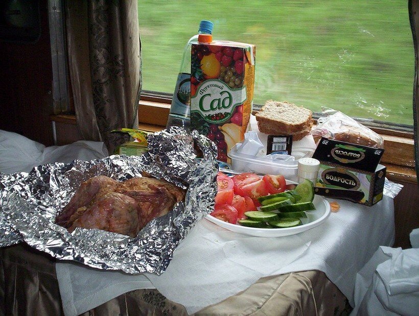 Итак, нам предстоит дорога. Не будем рассматривать такой вид транспорта как самолёт, в нём хоть как-нибудь, но покормят. Сегодня мы едем поездом! Любит наш человек, сев в поезд, завалить столик всевозможной едой и поглощать её, будто с голодного края едет) Но сейчас лето, и не во всех вагонах есть кондиционеры, так что жарко. А если плавимся мы, то тоже самое, только быстрее, происходит и с нашими продуктами. Что же взять с собой в дорогу, чтобы не отравиться? Прежде всего необходимо позаботится о своем здоровье и своевременно купить сумку-холодильник, причем аккумуляторную. В этом случае, мы с можем взять с собою так любимую всеми путешественниками жареную курицу! Но если сумки-холодильника нет, вагон-ресторан тоже отсутствует в поезде, то придется ограничить своё меню. Что же будет на нашем столике? Прежде всего это овощи, которые можно кушать сырыми: огурцы и помидоры. Кстати, дети очень любят грызть в поезде морковку! Так же берем с собою фрукты. Безусловно, всё должно быть вым