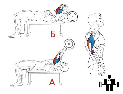 Французский жим (выпрямление рук в локтях со штангой лежа) - основное (наравне с жимом штанги узким хватом на прямой скамье) упражнение на развитие трехглавой мышцы плеча (трицепса). Многие спортсмены недооценивают опасность этого упражнения, которой особенно подвержены локти. Лучше всего выполнять его с партнером, который будет подавать штангу и забирать ее после выполнения последнего повтора. Какие мышцы задействуются в выпрямления рук со штангой лежа? Динамическая нагрузка приходится на трицепсы. Статическую нагрузку испытывают мышцы предплечья, плеч, корпуса (передние пучки дельтовидных, широчайшие мышцы спины). Как и жим узким хватом, французский жим развивает трицепс по всей длине. Тем не менее, большая часть нагрузки приходится на нижние и верхние его отделы, что визуально при продолжительных занятиях, проявляется в форме отчетливого пика. Техника выполнения французского жима Исходное положение: лежа на горизонтальной скамье, хват штанги узкий (не более 15 см между большими паль