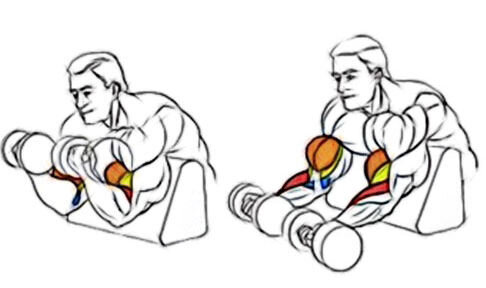 Подъемы гантелей на бицепсы на скамье Скотта (сгибания рук с гантелями на наклонной скамье) - изолирующее упражнение для прокачки среднего и нижнего отделов двуглавой мышцы плеча. Во многом идентично подъемам штанги на скамье Скотта, только нагрузка акцентируется чуть выше. Применяется для «забивки» («закачки») бицепсов. Упражнение может выполняться стоя и сидя, в зависимости от конструкции тренажера. Какие мышцы задействуются в сгибаниях рук с гантелями на скамье Скотта? Основная нагрузка приходится на бицепс (двуглавую мышцу плеча), особенно ее средний отдел, что при регулярном выполнении упражнения способствует образованию так называемого пика. Часть нагрузки ложится на мышцы-сгибатели внутренней поверхности предплечья (глубокий и поверхностный сгибатель пальцев, локтевой и лучевой сгибатели запястья, длинный сгибатель большого пальца кисти). Техника выполнения сгибаний рук с гантелями на скамье Скотта Исходное положение: стоя или сидя, с упором локтем в скамью. Высота подъема скамь