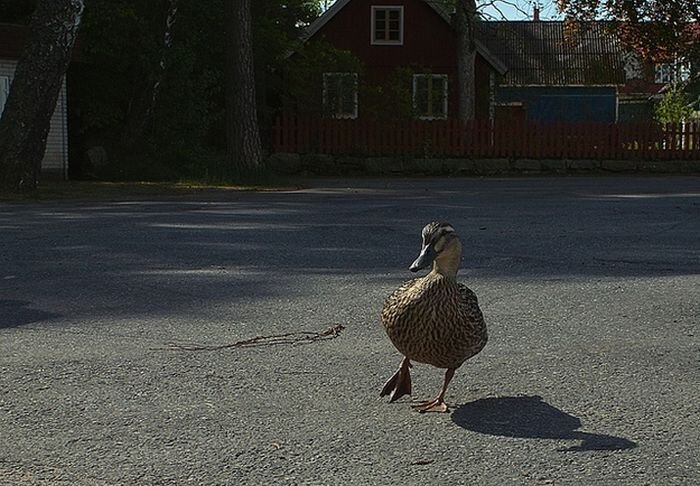 Утка, переводившая через дорогу своих птенцов, напала на таксиста, который пытался прогнать ее с проезжей части. После такого решительного отпора таксист оставил попытки прогнать ее.