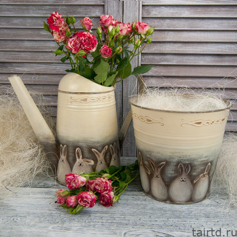 В этом мастер-классе я покажу, как делала декупаж металлической лейки и ведёрка себе на дачу. Изначально я думала, что ограничусь обычным декупажем, но салфетка, с которой я работала, оказалась очень капризной. Может, дело в покатости форм ведра и леечки, но салфетка нещадно пузырилась, шла складками и трепала мне нервы. Однако, отказываться от этих милых зайцев мне совершенно не хотелось, очень уж они запали мне в душу... Поэтому к декупажу добавилась подрисовка. Нам понадобятся следующие материалы: • заготовки из металла: лейка и ведро; • салфетка для декупажа; • декупажный лак-клей; • грунт акриловый; • рельефная паста тонкая; • краски «Акрил-Арт»: Умбра Жжёная, Умбра Натуральная; • краски «Акрил-Хобби Де Люкс»: Слоновая Кость Тёплая; • лак акриловый полуматовый; • синтетические кисти для хобби; трафареты; палитра; канцелярский файл; ножницы; малярный скотч. Итак, начинаем. Чтобы акриловые материалы хорошо сцеплялись с металлической поверхностью, для начала её стоит обезжирить любой