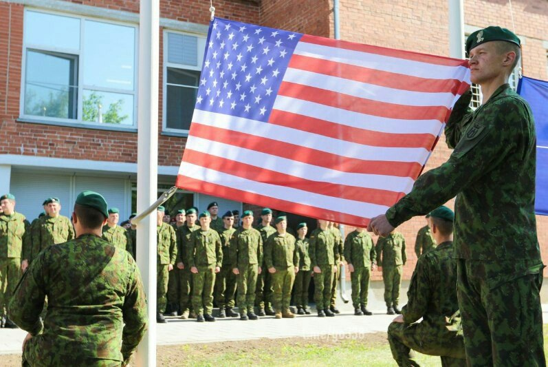 Военнослужащие соседней Литвы склонили колени перед американским флагом.