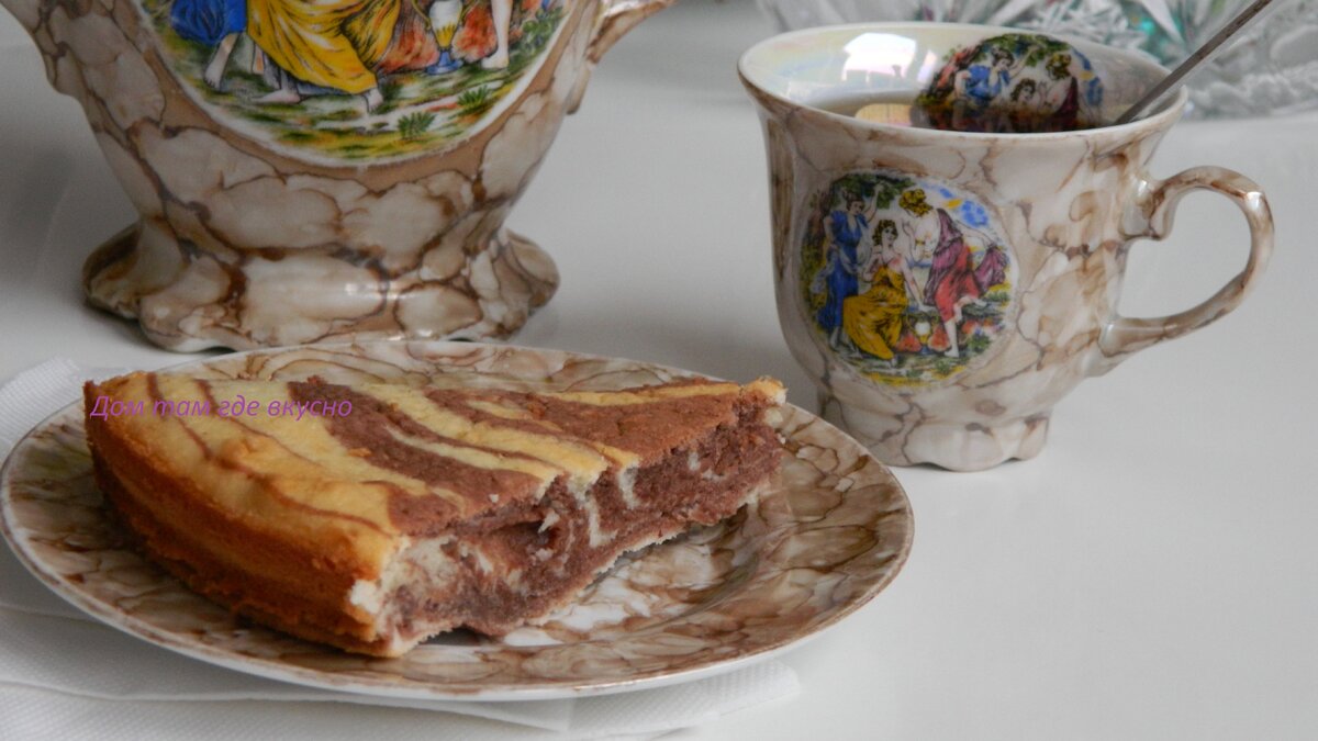 2 столовые ложки какао+ 2 столовые ложки муки Замесить тесто, разделить его на две части. В одну добавить 2 столовые ложки какао, а в другую две столовые ложки муки. Форму для запекания смазать маслом. Тесто выкладывать посередине формы по ложке: сначала ложку белого, потом ложку коричневого. Пирог отправить в духовку на 20-30 минут при температуре 180 градусов. Приятного вам чаепития! Если хотите больше хороших и вкусных рецептов, то подписывайтесь на канал.