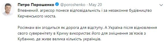 Порошенко говорил, что Крымский мост построить нельзя. Что Крымский мост - это показуха и фикция, и закончится провалом и позором для России. Как же радовались украинцы когда у моста просели опоры. Но Россия мост построила, утерев нос злопыхателем. Но Порошенко успокоиться не может, вот что он написал в твиттере. Перевод:"Уверен, агрессор понесет ответственность, за незаконное строительство Крымского моста. Россиянам он пригодится как дорога для отступления. А Украина, после восстановления своего суверенитета в Крыму, использует его, для укрепления связи с Кубанью, где живет большое количество украинцев!" Напомним, что на строительство Подольского моста через Днепр, протяженность которого 150 метров, выделено 400 миллионов гривень. При перерасчете на метр, он получается уже дороже чем Крымский мост. Но этот мост, до сих пор не достроенный. Этот мост приносит огромное стратегическое значение. Крым получает новые возможности для развития. Россиянам помогали мост строить, и америк