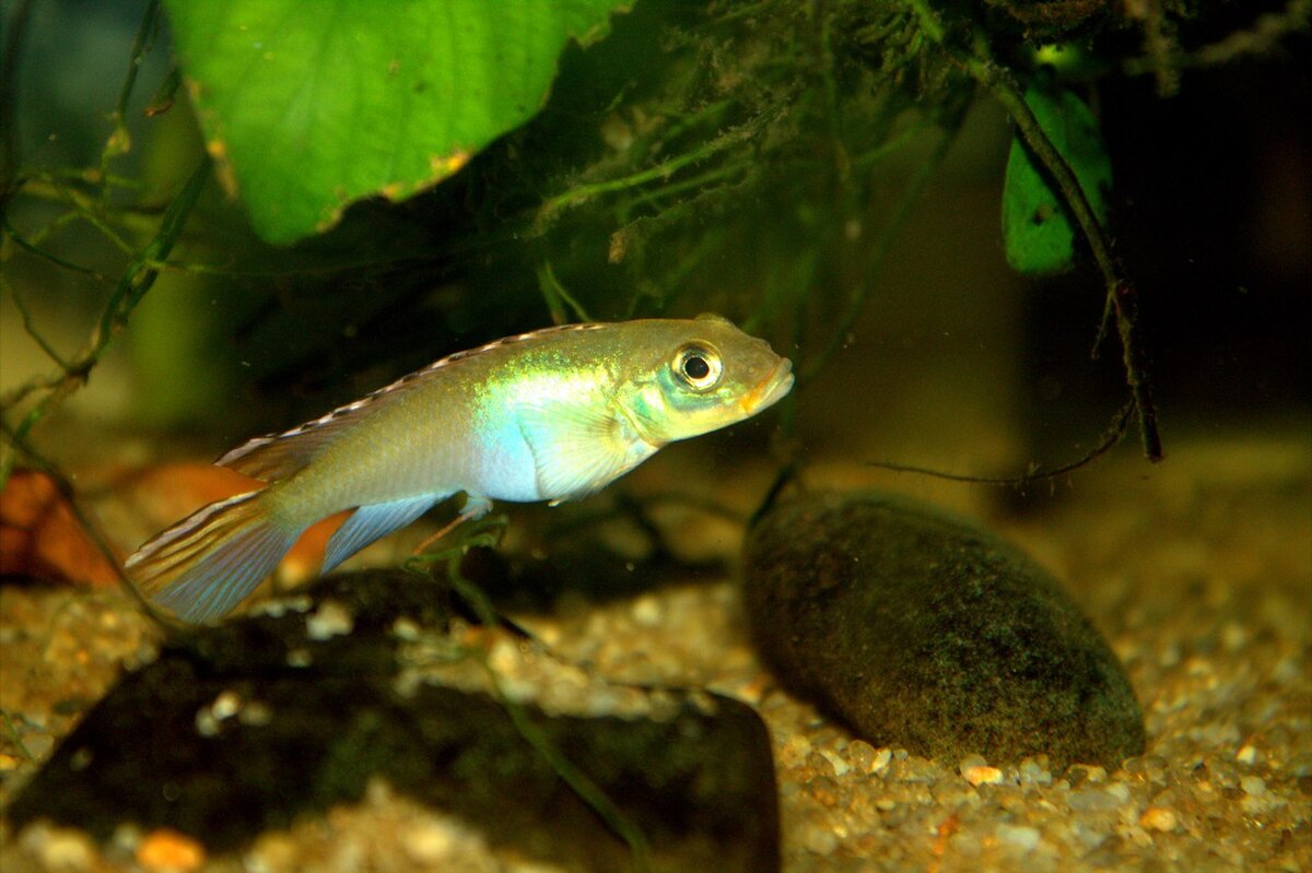 Эта некрупная цихлида ,единственный представитель речной Африки в моей коллекции. Чем то напоминают более распространенных пельвикахромисов -попугайчиков ,но с более вытянутым телом и без каких либо полос . Данный вид попал ко мне из дикой природы через Гляйзер . Заказал две пары ,с запасом , немцы не подвели и прислали все точно . В феврале 2017 года благополучно получил четыре 4 см рыбки и позже выделил одной паре 100 литров с песком в качестве грунта , анубиасами и несколькими керамическими укрытиями . Рыбы обжились и через месяц я начал подготовку к нересту . Так как икра оплодотворяется только в мягкой воде , пришлось лить талую воду в течении двух недель для получения продуктивного нереста . И вот в начале апреля я случайно увидел стайку мелкого малька с папашей на прогулке . В морозилке были замороженные науплии артемии ,поэтому с подходящим кормом для мелочи проблем не было . Впоследствии весь малек и другая пара отправились в Москву на ПМЖ к ценителю речной Африки ,где благоп