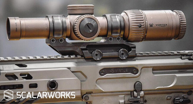 Scalarworks LLC показали свое первое крепление для полноразмерных оптических прицелов LEAP/Scope, построенное по фирменной технологии быстрой установки Quantum с зажимом основной трубы приборов вращающимися полукольцами на оси. Фиксация прицела происходит с минимальными допусками двумя увеличенными винтовыми зажимами на одной базе кольца, упрощая процесс крепления и позволяя ориентироваться только на усилие затяжки, без центровки положения полуколец как на моделях с раздельной конструкцией. Цельное основание устранит возможную деформацию из-за не соосности баз посадки прицела. Кронштейн производится из алюминия марки 7075-T6, который превосходит стандартный 6061-T6 в прочности и надежности, не утяжеляя конструкцию и составляя всего 155+ грамм. В скором времени ожидается выпуск модели с более привычными быстросъемными рычагами для фиксации крепления на планке.