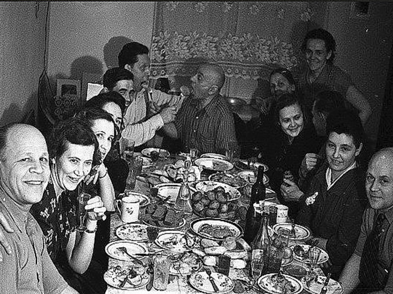 После преодоления последствий Второй мировой, люди пытались жить красиво. Кто как мог. Удивительно то, что среди большого изобилия блюд для праздничного стола некоторые яства оставались неизменными для всех праздников и мероприятий. Русский обычай гласит: "Накрывай стол, пока гость не пришёл", поэтому сервировка, проходила задолго до появления гостей. Стол просто ломился от изобилия различный блюд, а в особенности холодных закусок. Главной была конечно же, селёдочка под шубой, которая начисто съедалась к концу застолья. Маринованные грибы в тандеме с огурчиками и помидорчиками культурно устраивались праздничном столе. Как правило, все эти вкусности подавались в расписном хрустале. А какой же аромат исходил от этого изобилия... ммм... Почётное место занимал салат оливье: ну как же без него? Этот головокружительный аромат перебивал запах остальных блюд. Как полагалось, смачный пучок петрушки втыкался в середину салата, который пышной шапкой возвышался над остальными кулинарными изыска