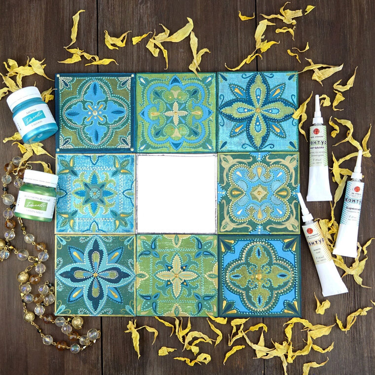 Далее раскладываем все расписанные плиточки по периметру зеркальца. На этом этапе можно выбрать удачное расположение каждой плиточки и посмотреть как они будут перекликаться между собой.