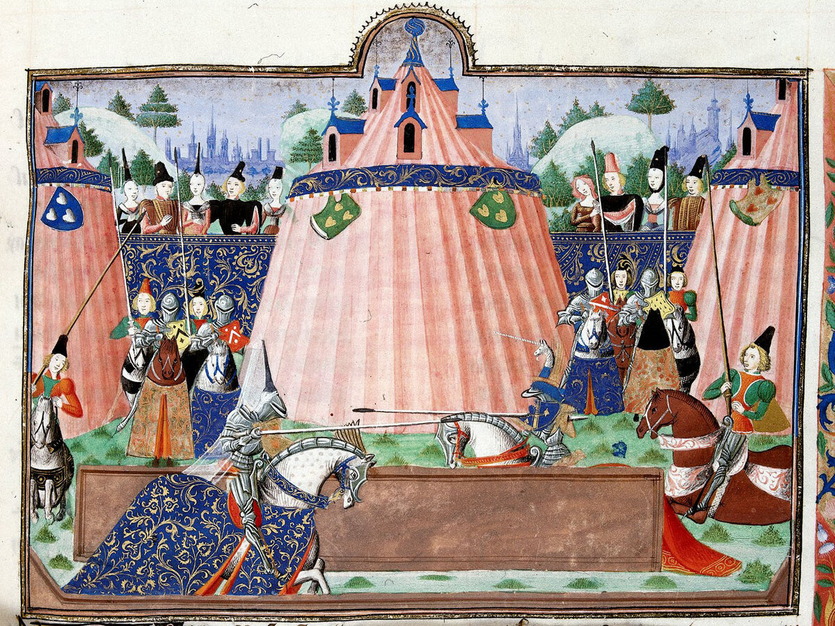 Столетняя война это не только битвы при Креси, Азенкуре, шевоше Черного Принца и прочие бои за замки и города. Сама война не продолжалась все сто с лишком лет. На самом деле она вообще занимала не так много времени и была совсем не такой тотальной, как в XX веке. Те же жуткие английские шевоше занимали полосу в несколько километров, по пути следования армии. А в остальных местах все было как и раньше. Ну и кроме того Столетняя война – это турниры. Их было много, особенно во время затишья в войне. Одним из таких турниров стало мероприятие в Сен-Энглевере, проходившее в мае-июне 1389 года. Началось все с того, что три французских рыцаря Жан Ле Менгр (который потом станет маршалом Бусико), Режинальд де Руайе и сеньор де Сен Пи получили у короля Карла VI, который тогда еще был молод, полон сил и, что самое главное, не сошел с ума, разрешение бросить вызов всем английским рыцарям, а до кучи и рыцарству других стран. Троица заявила, что двадцать дней они будут защищать турнирное поле п