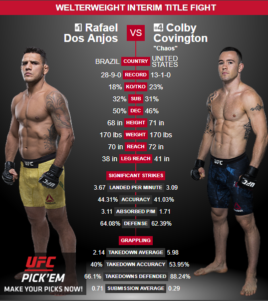 Битва двух титанов, Рафаэля Дос Аньоса против Колби Ковингтона! Одни из самых талантливых бойцов в полусреднем весе. Рафаэль Дос Аньос - 33 года, рост 175 см, вест 77 кг. 28 побед и 9 поражений. Из 28 побед, 5 побед нокаутом, 9 сдачей, 14 решением судей. Стиль бойца - тайский бокс и бразильское джиу-джитсу. абсолютно разносторонний боец, отлично работает и руками, и ногами. предпочитает драку в стойке борьбе в партере. Хотя и в борьбе показывает себе очень уверенно. Колби Ковингтон - 30 лет, рост 180 см, вес 78 кг. На своем счету имеет 13 побед и одно поражение. Из 13 побед 2 - нокаутом, 5 - сдачей, 6 - решением судей. Не такой разносторонний боец, как Рафаель, при этом очень уверено чувствует себя в борьбе, что и является его основным направлением. Какой же вывод можно сделать из данного поединка? - Однозначная победа Дос Аньоса. Опыт и сумасшедшее желание сразиться с Тайроном Вудли, за пояс чемпиона, который он ранее утратил, однако пожелаем удачи обоим спортсменам в предстоящей сх