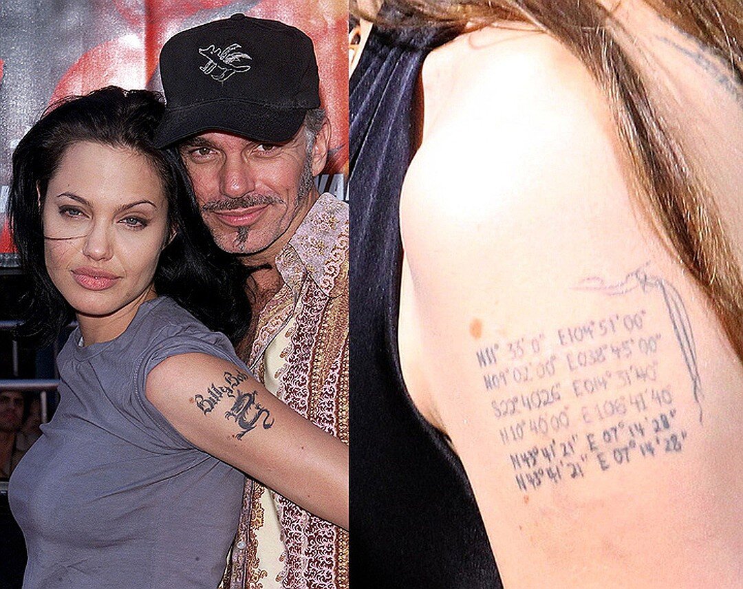 На теле голливудской кино-дивы и режиссера, 43-х летней Анджелины Джоли в разное время имелось около двух десятков различных татуировок. В честь своего второго супруга, киноактера и исполнителя Билли Боба Торнтона она сделала наколку с его именем на левом плече. Справедливости ради стоит добавить, что Билли поступил взаимно, и тоже набил татуировку с именем возлюбленной. Однако, спустя три года их брак рухнул, супруги развелись и поспешили избавиться от тех самых татуировок, сделанных в порыве страсти. Анджелина убрала не только имя бывшего мужа, но и расположенного рядом с этой надписью симпатичного дракончика. Вместо этого, на её левом плече начали появляться загадочные надписи из цифр. Как позже выяснилось, это были координаты тех мест, где появились на свет все шестеро её наследников. Можем смело предположить, что эта татуировка останется с Джоли навсегда, ведь любовь к детям не исчерпает себя никогда.