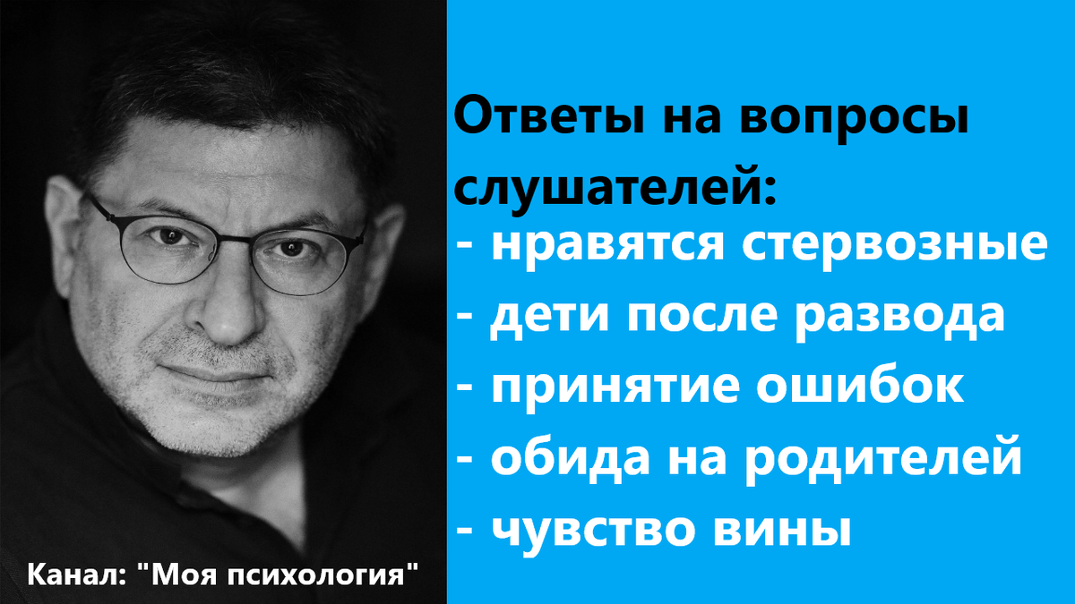 В очередном ролике "Взрослым о взрослых" психолог Михаил Лабковский отвечает на вопросы слушателей. Среди них: - о том когда нравятся стервозные, - о воспитании детей после развода, - о принятии ошибок молодости, - об обиде на родителей, - о чувстве вины Лабковский лекции слушать онлайн.