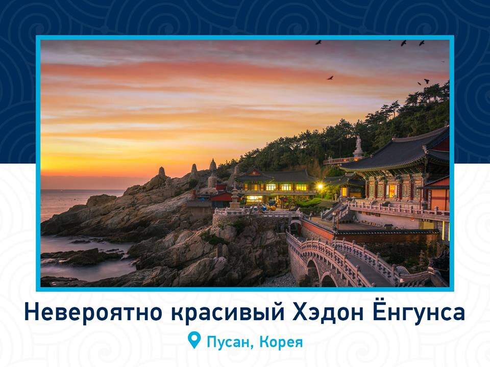 Хотите, чтобы ваше желание исполнилось?🙏 Возможно, мы сможем вам помочь. В Корее есть поверье, согласно которому искренняя молитва или желание, загаданное в храме Хэдон Ёнгунса, обязательно сбывается. Именно по этой причине этот храм очень популярен как у местных жителей, так и у туристов. Но и это еще не все! Считается, что одна из статуй Будды этого храма может излечить болезни. Кстати, «Хэдон Ёнгунса» в переводе означает «храм дворца дракона 🏯 морского Будды». Считается, что одно из воплощений Будды является многим здесь на спине у морского дракона. Поэтому Будда храма покровительствует всем, кто связан с морем и водной стихией. А еще Хэдон Ёнгунса невероятно красив😍! Храм стоит на живописных прибрежных скалах на самом берегу моря - восходы и закаты здесь поражают воображение.