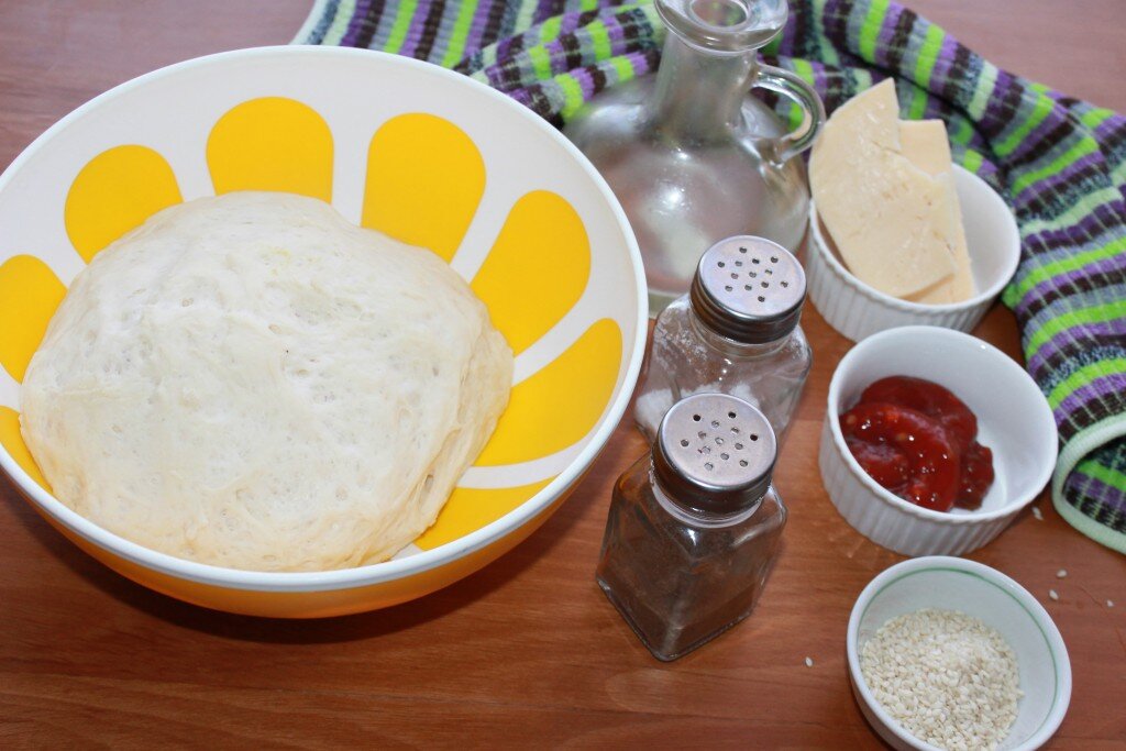 Розочки из дрожжевого теста с твердым сыром, кунжутом и кетчупом