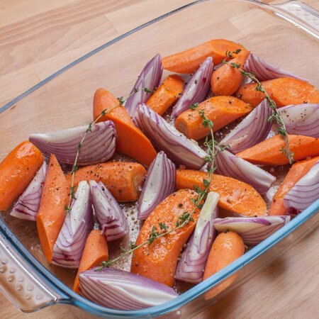 Овощи нарежьте крупными дольками, выложите из них подиум для мяса, соль, перец по вкусу, советую добавить пару веточек тимьяна и розмарина. Поместите в духовку на 20 минут, при 180 градусах.