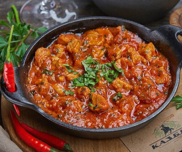 Приготовление этого блюда будет изумительным, если готовить его в казани, но если нету то просто на сковороде. Мясо должно быть молодое. Режем его брусочками, сверху льём растительное масло и посыпаем перцем, мешаем и оставляем его. В казане жарим мелко нарезанный лук, добавим перец и выдавим чеснок. Телятину или говядину жарим на отдельной сковородке, но так, чтобы кусочки мяса друг друга не косались, и переворачивать из нужно отдельно, это нужно для того чтобы мясо не потеряло свой сок. Далее кладём мясо к овощам, добавляем специи, аджику, томатный сок и тушим 10 минут на среднем огне. Режем крупными кубиками помидоры и закидываем в казан, наша цель их просто подогреть, поэтому минуты 3-4 хватит. Засыпаем все зеленью и подаём на стол.