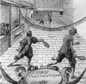 Большинство спортивных терминов попало во французский язык из английского. И слово tennis — не исключение. Интересно при этом то, что и название игры, и система подсчета очков в ней имеет чисто французское происхождение. Но все по порядку. Еще в XI (одиннадцатом!) веке французские монахи придумали игру в мяч, которая называлась jeu de paume — игра ладонью. Это игра получила колоссальную популярность во Франции. Английский путешественник в начале XVI в. писал: «Французы рождаются с ракеткой в руке... Эта страна усеяна залами для игры в мяч, которых больше, чем церквей, а игроков больше, чем посетителей английских пабов". К XVII веку в Париже насчитывалось 1,800 (!!) залов и открытых площадок для игры в jeu de paume. Говорят даже, что во Франции в это время было принято желать не bonjour, a bonjeu. Суть игры заключалась в перебрасывании мяча через веревку — сперва действительно голой рукой, затем появились перчатки, а им на смену пришли ракетки; веревку заменила сетка — ну теннис тен