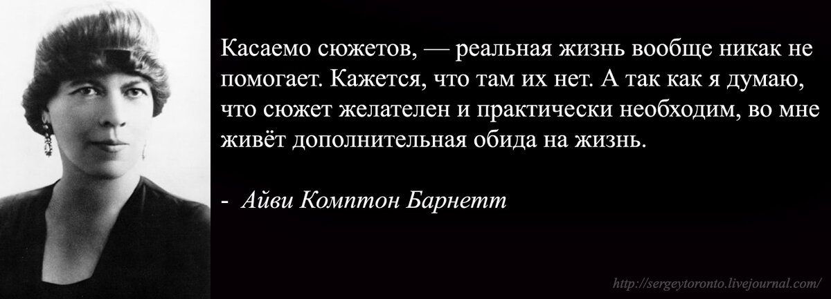 5 июня 1884 – 27 августа 1969 Касаемо сюжетов, — реальная жизнь вообще никак не помогает. Кажется, что там их нет. А так как я думаю, что сюжет желателен и практически необходим, во мне живёт дополнительная обида на жизнь. - Айви Комптон Барнетт