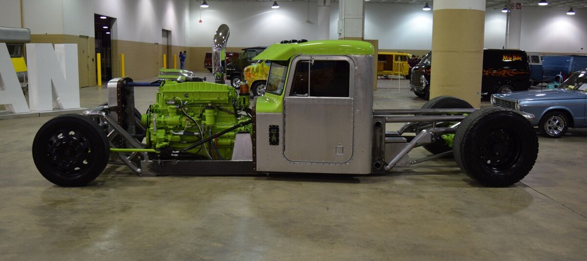 Термин «Рэт род» означает машину, собранную из деталей, оказавшихся под рукой. Чаще это старые ржавые железяки со свалки, но иногда — просто результат работы «безумного гаражного ученого». Такие аппараты — гимн аскетичной функциональности на колесах — если деталь «на скорость не влияет», значит можно обойтись без нее. Короче, это идеально подходящее слово для описания этого чудовища. В тягаче Peterbilt 80-х годов, судя по всему, остался не тронутым лишь шильдик на «носу». Полностью кастомная рама, открытые колеса, здоровенная выхлопная труба. И гигантский дизель Cummins c наддувом, из которого на 70 процентов и состоит машина. Небольшим компромиссом с общественным мнением можно считать пневмоподвеску и то, что он вообще покрашен, однако давайте пожалеем обывателей — настоящую «крысу» таких размеров хрупкое сознание обывателя может и не вынести. Хотя… где-то живет вот такое чудовище, подробную информацию о котором я надеюсь однажды найти. А пока можете оценить зеленого плох