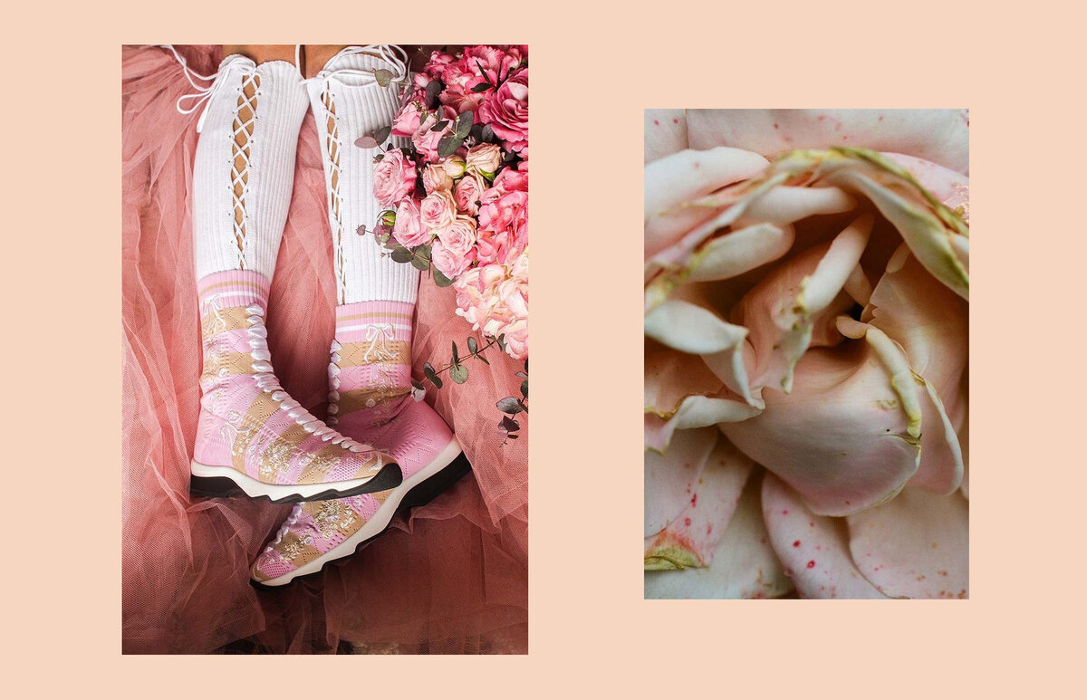 Итальянцы из Fendi подхватили тренд, чтобы создать розовые кроссовки, украшенные барочной вышивкой из бантов и полевых цветов. Почему они цепляют? Потому что кроссовки сделаны как будто специально для современной Марии-Антуанетты, беззаботной и бесстыже роскошной. Надо понимать, что Fendi сильно зависит от азиатской публики. Как известно, в Японии любят самобытные яркие вещи.Такая обувь хорошо сочетается с чулками Prada (как на фотографии выше).