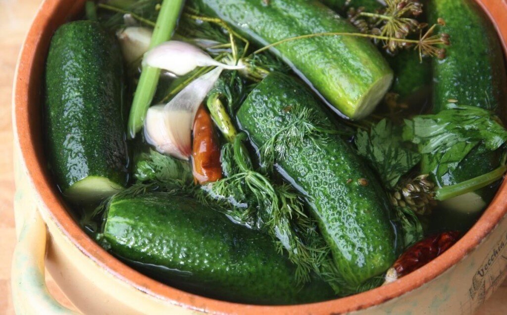 Малосольные огурцы в жаркое лето любят очень многие. Приготовить такие огурчики очень просто и быстро в кастрюле. Для этого прекрасно подходят маленькие и средние огурчики, они очень быстро готовятся и получаются хрустящими вкусными. Ингредиенты: Приготовление: Огурцы хорошо моем, обрезаем кончики с обоих сторон. Ели огрурцы подвяленые, где то долго лежали, то их сначала замачиваем в холодной воде на 3 часа. После этого они становятся сочным и твёрдыми. Зелень хорошо моем и даем стечь воде, чеснок режим на пластинки. На дно кастрюли складываем часть зелени, укладываем огурцы, затем снова закрываем зеленью. В другой кастрюли готовим маринад. Для этого в 1 л воды разводим соль и кипятим 2 минуты. Вливаем горячий рассол в кастрюлю с огурцами. Маринад должен полностью покрыть огурцы. Если не хватает, то дополнительно кипятим воду с солью. На огурцы ложим тарелку и ставим гнет. Оставляем огурцы при комнатной температуре на 6-8 часов. После чего убираем в холодильник, когд