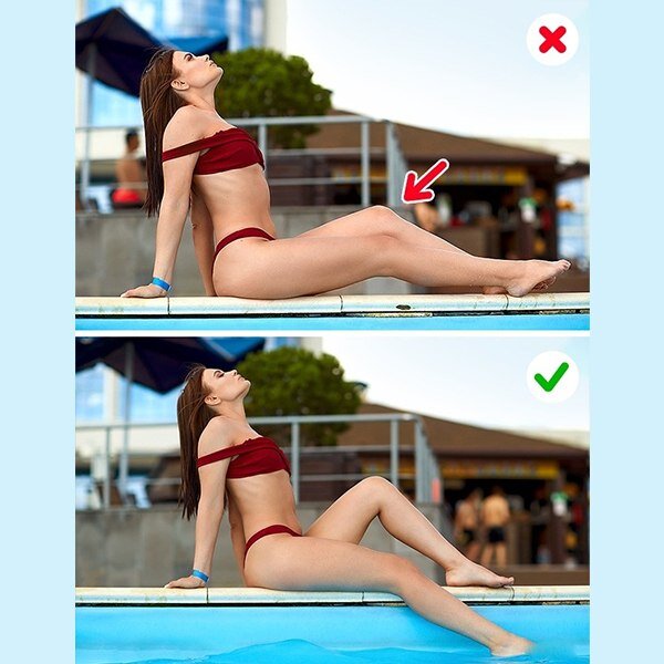 Всем нам хочется привезти с отдыха крутые фотографии, которые не стыдно показать друзьям и выложить в соцсетях. Но, как правило, из-за нелепых позы или неправильный ракурс, большая часть снимков так и остается в недрах памяти наших гаджетов. № 1. «Двойная» нога № 2. Колени смотрят в камеру № 3. Ракурс сверху № 4. Акцент не в лице № 5. Слишком близко к воде № 6. Поза солдатика № 7. Ступнями в камеру № 8. Одинаковые фотографии № 9. Притянутые колени к груди № 10. Не опираться № 11. Следите за осанкой
