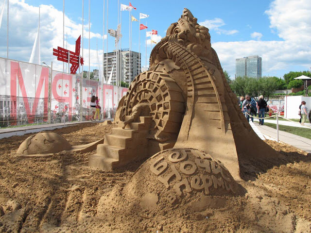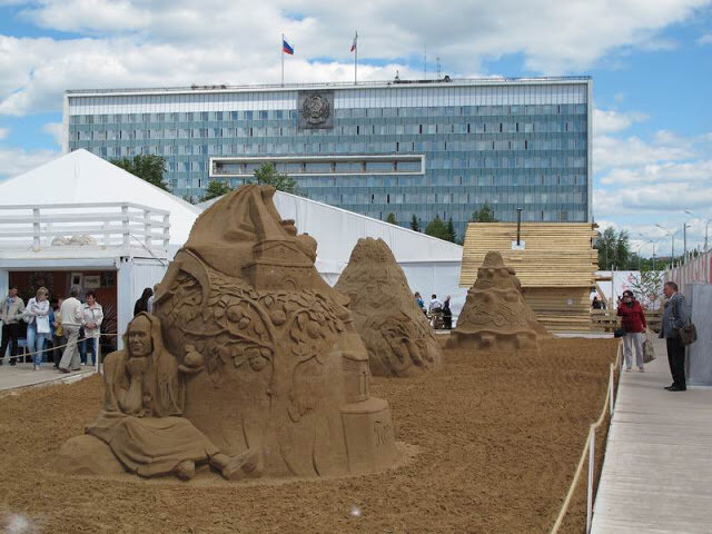 Значительную часть фестивальной площадки "Белые ночи Перми 2012" занимают песчаные скульптуры. Судьба их из-за погодных условий первых дней фестиваля висела на волоске. Но сейчас почти все обрушения бережно восстановлены. Кому как, а мне очень понравилось. Тем более есть с чем сравнить, когда-то на ВДНХ я видел подобное. Если не по масштабности, то по количеству скульптур Пермь Москву переплюнула. Единственный вопрос у меня остался к организаторам по поводу размещения скульптур. Тут получился какой-то заколдованный круг. Как не ходи, но скульптуры в основном повернуты к тебе задом, а если лицом, то смотреть приходится против солнца. В общем логику размещения я так и не понял. Может быть это связано с особенностью изменения материала под воздействием солнца? Но ведь его обрабатывают раствором ПВА, чтобы скульптуры не рассыпались. Кстати, обрушение произошло потому что пропитка до дождя не успела высохнуть, а так как она водорастворимая, то ливни сделали свое черное дело.