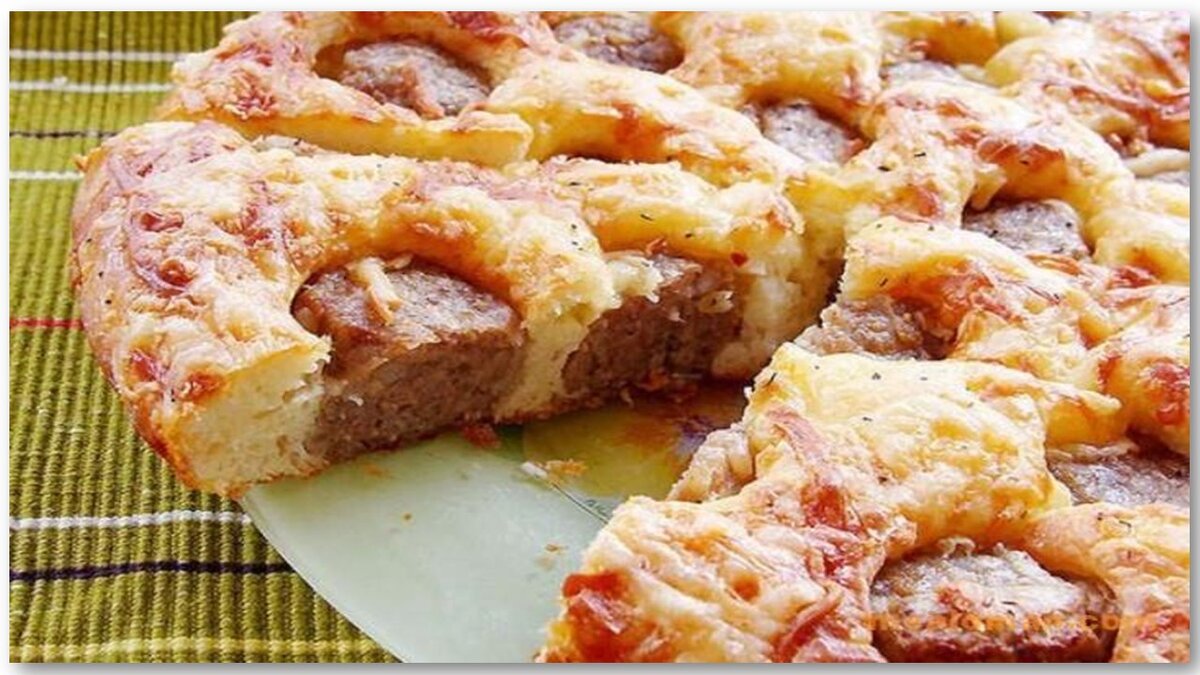 Получается сытный и вкуснейший пирог. Ингредиенты для приготовления: ❦ муки-200 грамм ❦ фрикадельки-500 г ❦ соли(по вкусу)-1/2 чайной ложки ❦ твердый сыр-150 г ❦ яиц-три штуки ❦ сметаны-250 грамм ❦ разрыхлителя -одна чайная ложка Если домашние фрикадельки ,то нужно их слегка заморозить. Для приготовления пирога можно воспользоваться и покупными фрикадельками,но только их перед использованием необходимо достать из морозилки для разморозки за 30 мин.до приготовления пирога. Приготовление: 1)Со сметаной взбиваем яйца и добавляем к данной смеси муку,заранее перемешанную с солью и разрыхлителем.Замешиваем густое тесто (как на оладьи). 2)В форму для выпечки(заранее смазать ее маслом) нужно залить тесто и вдавить фрикадельки на расстоянии приблизительно 2 см . 3)В промежутках между фрикадельками посыпать заранее натертым сыром. 4)В духовке пирог выпекаем минут тридцать при температуре 180 С. 5)Дать постоять готовому пирогу,чтобы сок мясных фрикаделек впитался в
