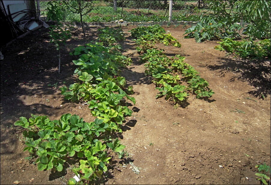 А началось всё с того, что надоел мне свинорой. Сорняк с таким поэтическим названием поселился под плитами инкерманского камня, которыми выложены у меня дорожки, а под плитами мелкий гравий. И непрерывно ползёт оттуда. Это чтобы его вывести, надо разворотить все дорожки! Поэтому решение одно - гербицид. Пошёл на рынок купить флакончик Торнадо, а там во-всю продолжается торговля рассадой. И не весенней, тощей, выгнанной под искусственным светом, а уже взраставшей под крымским солнышком, корневая у неё заглядение, такие мочалки... Как тут удержаться? Короче, купил ещё пару десятков рассады разных сортов помидоров и пару десятков болгарских перцев, нехай растут :) тем более десяток стоит всего 50 рублей,чуть не вдвое дешевле, чем месяц назад. В прошлой записи я рассказывал, как удалял состарившуюся клубнику, вот эту: Потом засеял эту и другие освободившиеся грядки семенами фацелии, сидерата. А тут подумал - там же можно и помидоры с перцем посадить:) Так что вчера эта грядка выглядела уж