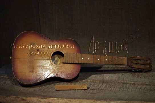 Запустили меня как-то на чердак старого вепсского дома, где разжилась кучей ценностей, дорога которых лежала в печку, а привела ко мне в мастерскую. Так старая детская гитара с треснувшей декой и болтающимся грифом оказалась в компании каменного жернова, старых чугунков и сит.