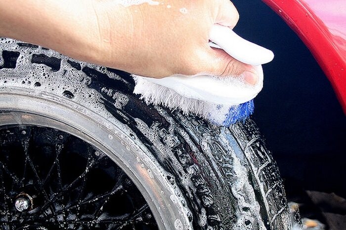 На шины могут влиять различные химикаты, в том числе бензин, масло и растворители. Поэтому перед тем как поставить колеса на хранения их нужно помыть.Вы можете сделать это, используя теплую воду, смешанную с автомобильным шампунем, либо просто мыльным раствором. Просто очистите шины, используя губку или щетку, и после мытья тщательно промыть.