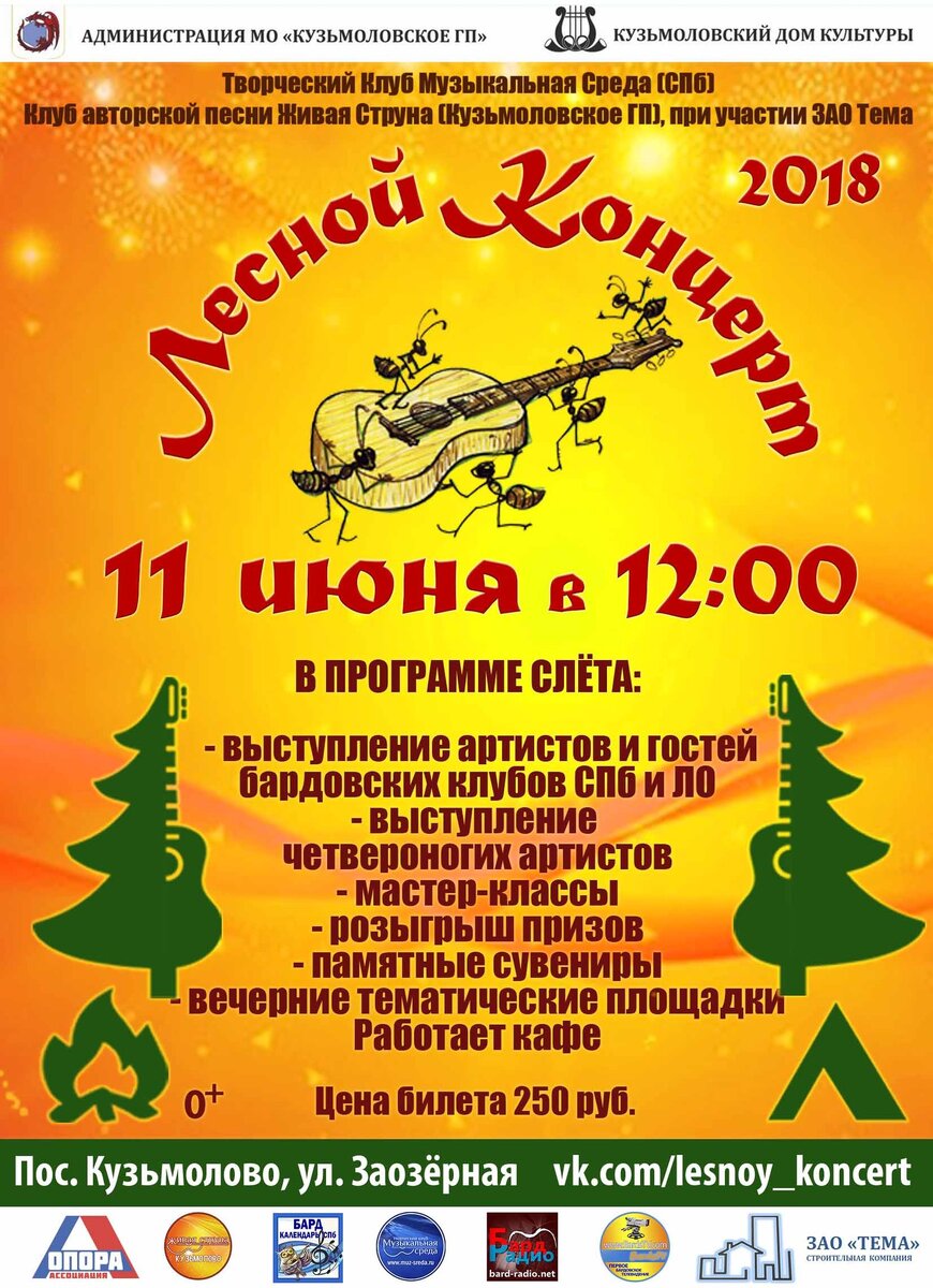 11 июня 2018, 12:00 - 12 июня, 14:00 11 июня 2018 года в поселке Кузьмолово, всего в получасе езды от СПб, состоится девятый слет любителей авторской песни «Лесной Концерт», который организуют и проводят Творческий Клуб «Музыкальная Среда» (СПб), Клуб авторской песни «Живая Струна» (Кузьмолово), Администрация пос.Кузьмолово и МУ «Кузьмоловский Дом Культуры». Слет проводится при поддержке ЗАО «Тема».