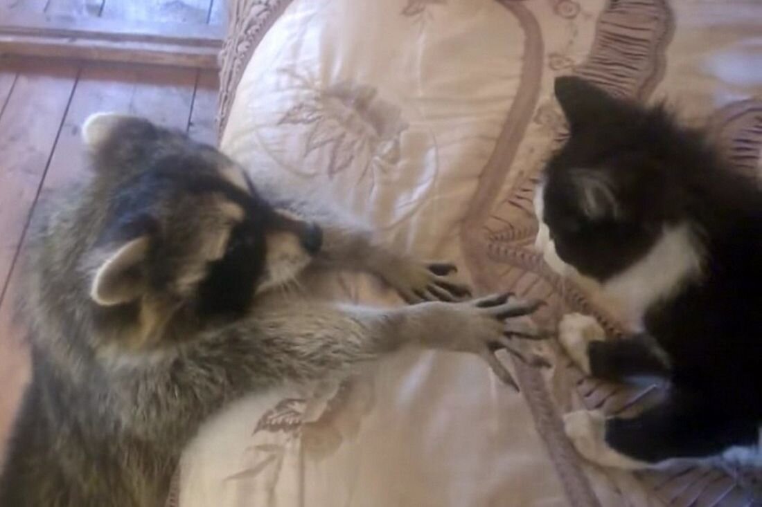 Пример тому геройой этого ролика, который решил подружиться с котом. И посмотрите, какой он деликатный!