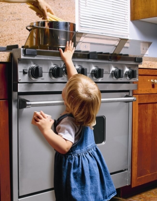 Дети крайне любопытны и познают окружающий мир на вкус или тактильно. А нам, взрослым, необходимо позаботиться об их безопасности на кухне. Кухня должна быть оборудована по всем правилам и учитывать возраст и любопытность маленького человечка. Не подпускайте детей к плите В ваших силах сделать все возможное, чтобы дите не тянуло свои ручки к включенным комфоркам, горячим кастрюлям и варочной поверхности. Всегда отворачивайте ручки кастрюль и сковородок! Хорошим защитным средством является экран или барьер на плите. Держите высоко или на замке опасные секции Думаю, вы храните порошки, моющие средства внизу под раковиной? Что открывает превосходный доступ к опасной бытовой химии и утвари. Поэтому двери шкафов и выдвижные ящики необходимо запереть м помощью специальных замков. Блокируем бытовую технику Любая бытовая техника несет в себе угрозу для малыша - он может удариться током, порезаться или обжечься, поэтому также как и для шкафов и дверц используйте замки-блокираторы. Осторожно