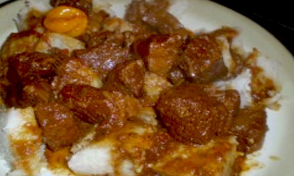 Блюдо карибской кухни Основное блюдо на 6 персон Продукты: 1,2 кг говяжьей вырезки; 1 большой помидор; 1 большая луковица; 2-3 больших зубчика чеснока; 2 небольших лимона или лайма; 2 чайные ложки без горки тертого свежего имбиря или 1 чайная ложка без горки сухого; 2 столовые ложки зелени кинзы; 2 столовые ложки зелени тимьяна (или 2 чайные ложки без горки сухого); 4-5 столовых ложек растительного масла; 1-2 чайные ложки (или по вкусу) вустерского соуса; 2 столовые ложки с небольшой горкой сахара черный перец молотый; душистый перец молотый; соль; Приготовление: Мясо нарежьте кубиками 2-3 см. Лук нарежьте мелко. Чеснок раздавите или измельчите. Помидор нарежьте небольшими кусками, как на салат. Нарубите зелень. Выдавите сок из лимонов или лаймов. Положите нарезанное мясо в глубокую миску. Залейте большим количеством воды. Добавьте лимонный сок. Хорошо промойте мясо в течении минуты. Воду с соком слейте. К мясу добавьте 1 чайную ложку без горки соли, щепотку душистого перца, 2-3 щепо