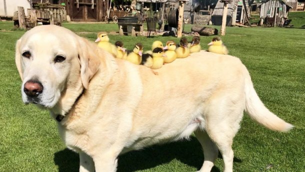 В Великобритании лабрадор по кличке Фред стал приемным "отцом" для 9 утят. Как пишет британский таблоид The Mirror, мама-утка неожиданно исчезла и 10-летний пес взял их под "свою лапу". Милое семейство живет в замке Монфитхет, что в графстве Эссекс.