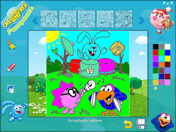 Программа «Раскрась Смешариков», не что иное, как детская раскраска только не на бумаге, а на компьютере, и вместо кисточек и карандашей дети раскрашивают мышкой картинки из известного мультсериала «смешарики».