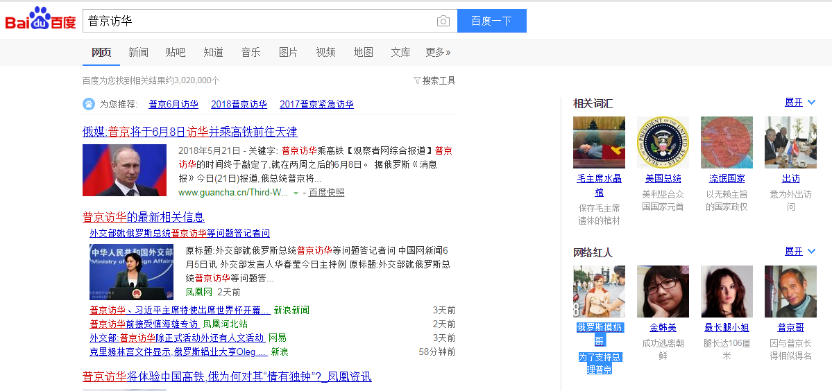 Захотел я посмотреть, ка к китайские СМИ освещают визит Владимира Путина в Китай в июне 2018 года, и внезапно в окошке справа появился некто "俄罗斯摸奶哥为了支持总理普京 / Русский парень трогал девушек за грудь в поддержку Путина".