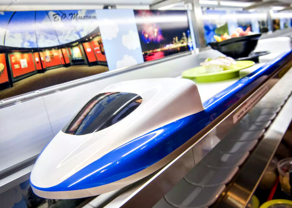 В суши-ресторане Hana Sushi в Торонто запустили уникальную систему доставки заказов до столиков клиентов. Суши гостям заведения подвозят с помощью монорельса. Скоростной поезд останавливается прямо напротив столика. Заказчику остается лишь забрать еду со столь необычного подноса и отправить его назад нажатием кнопки. Уникальная система скоростной монорельсовой доставки начала работать в ресторане 28 марта 2018 года.