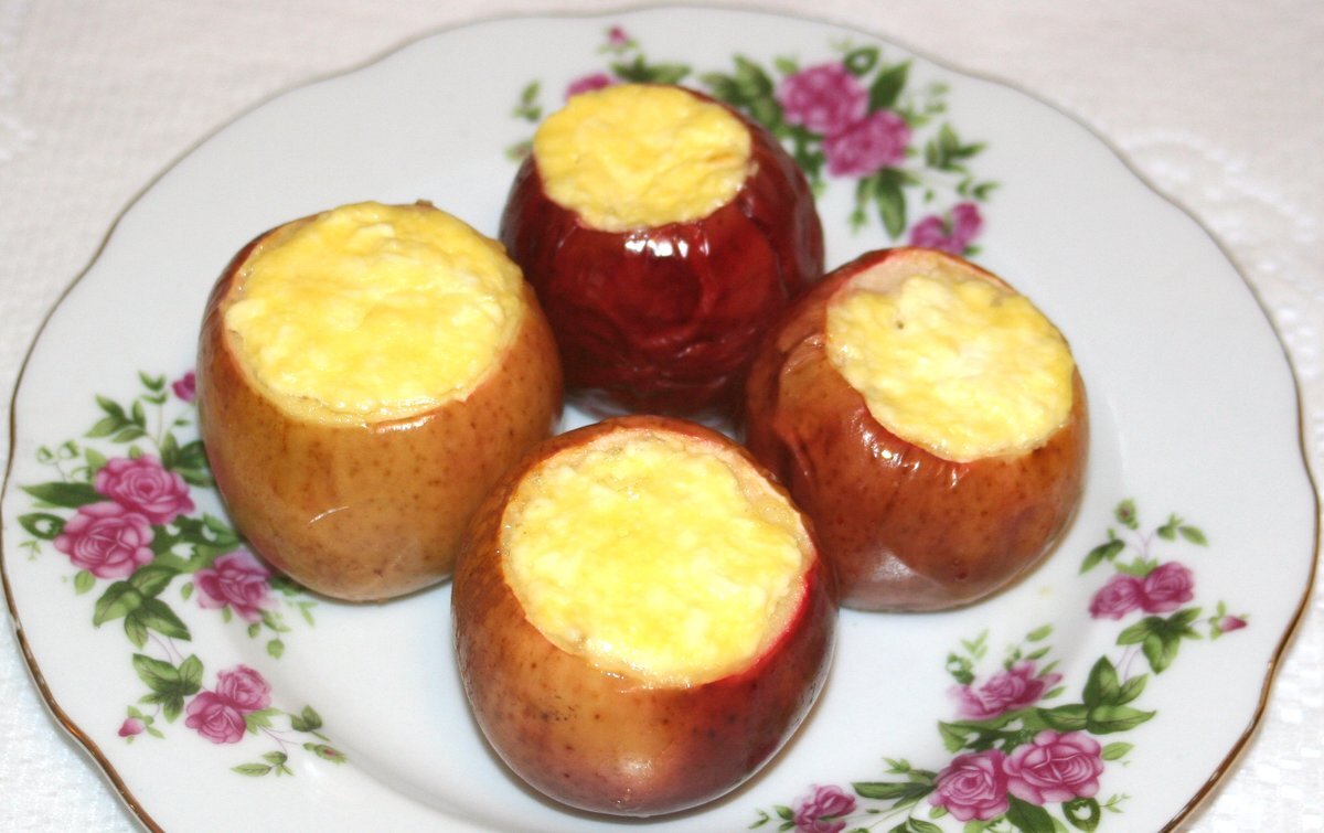 3) Очищаем яблоки от кожицы и вырезаем середину. Середину наполняем начинкой.
